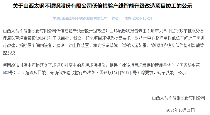 2024年10月21日,山西太鋼不銹鋼股份有限公司低倍檢驗產(chǎn)線智能升級改造項目竣工公示。