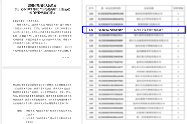 近日,溫州市龍灣區(qū)人民政府公布2021年龍灣區(qū)(高新區(qū))“畝產論英雄”工業(yè)企業(yè)綜合評價結果,溫州市華海密封件有限公司被評為A類企業(yè)。